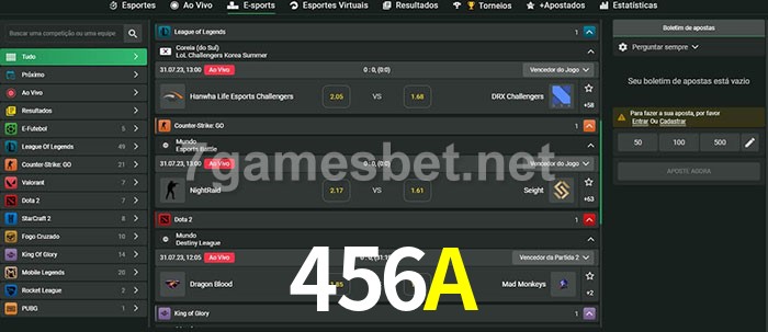 O 456A oferece uma grande seleção de opções de apostas em e-sports com probabilidades competitivas